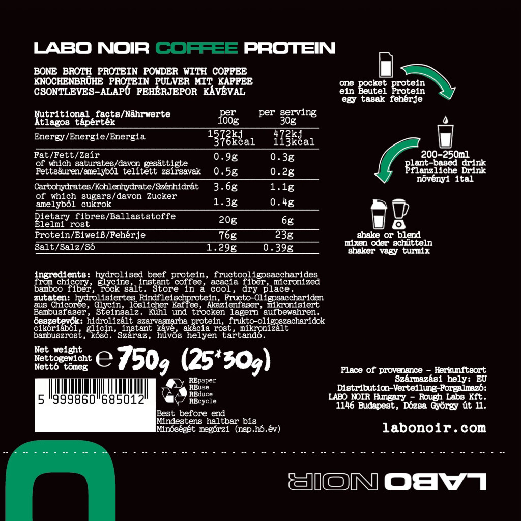 A Labo Noir Collagen Protein Coffee 750 a kiváló minőségű fehérjét célzott kollagénpeptidekkel és természetes kávéaromával ötvözi. Egy adag 23 g fehérjét tartalmaz, ebből körülbelül 19 g a három fő kollagéntípusból származik (I, II és III). Ez az összetétel ideális mind fokozott fizikai megterhelés esetén, mind a mindennapokban az alapvető fehérjebevitel támogatására.