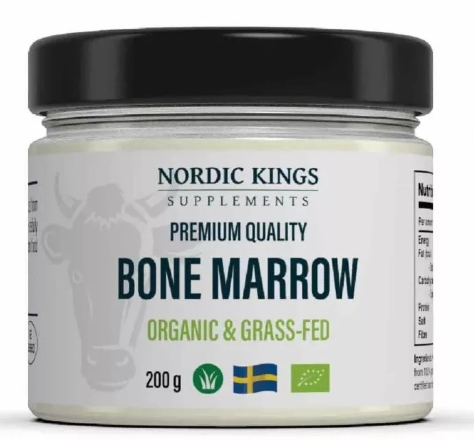 A csontvelő egyenesen a csontból kötőszövetet és némi fehérjét is tartalmaz. A Nordic Kings gondosan megszűri a csontvelőt, hogy kivonja a szövetdarabokat. Ezt üvegedényekbe csomagolják, hogy a konyhában kényelmesebb legyen a használata. A Nordic Kings csontvelő 100% csontvelőt tartalmaz adalékanyagok nélkül.