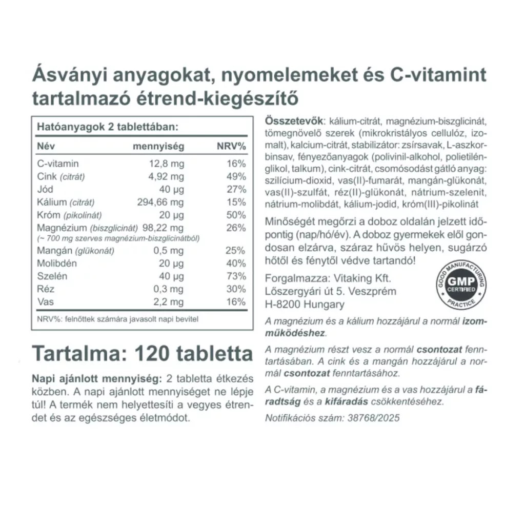 A 120 tablettás változat hosszabb távú használatra is praktikus választás, így kényelmes megoldást jelent a mindennapi ásványianyag-kiegészítéshez.
